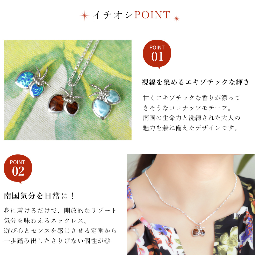 視線を集めるエキゾチックな輝きのココナッツモチーフのネックレス。