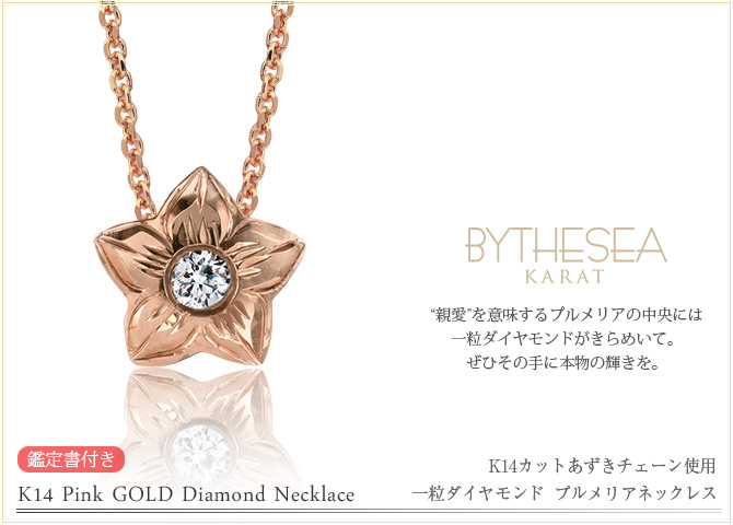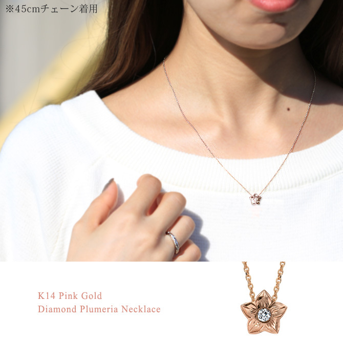 ハワイアンジュエリー 一粒ダイヤモンド プルメリア ネックレス カットあずきチェーン太さ0.9mm