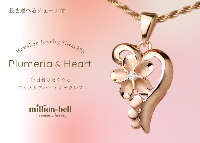 艶やかな美しい曲線のハートにキュートなプルメリアを添えて。可愛らしさとエレガントさを兼ね備えた魅力あふれるアイテムです