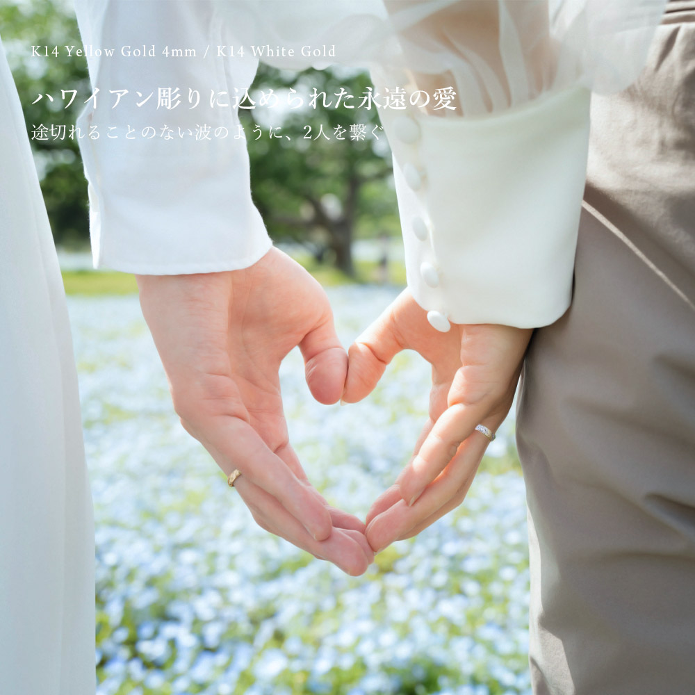 程よい存在感と上品さの約4mm幅ペアリング。K14イエローゴールド×ホワイトゴールドの男女ともにオススメアイテム。
