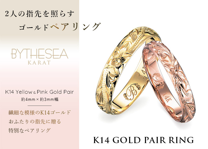 程よい存在感のイエローゴールド約4mm幅と絶妙な存在感のピンクゴールド約3mm幅のペアリング。人気のゴールドペアリング。