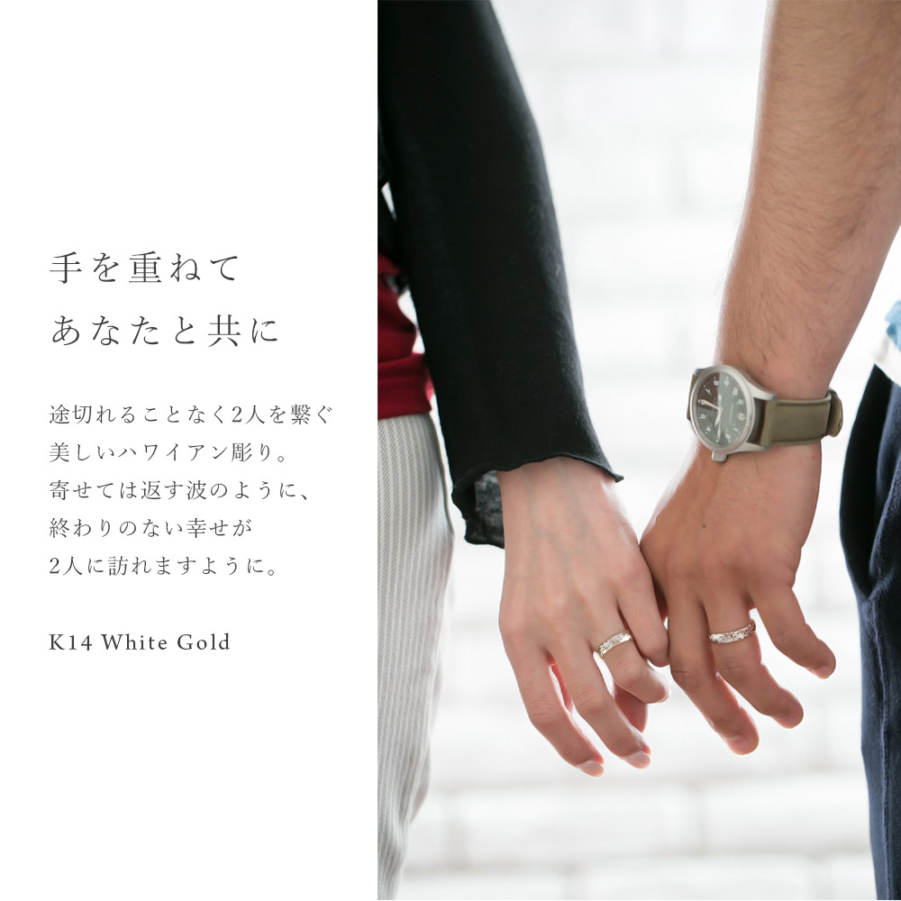 程よい存在感と上品さで一度つけたら虜になる輝きのK14ホワイトゴールドペアリング。男女ともに人気の約4mm幅。