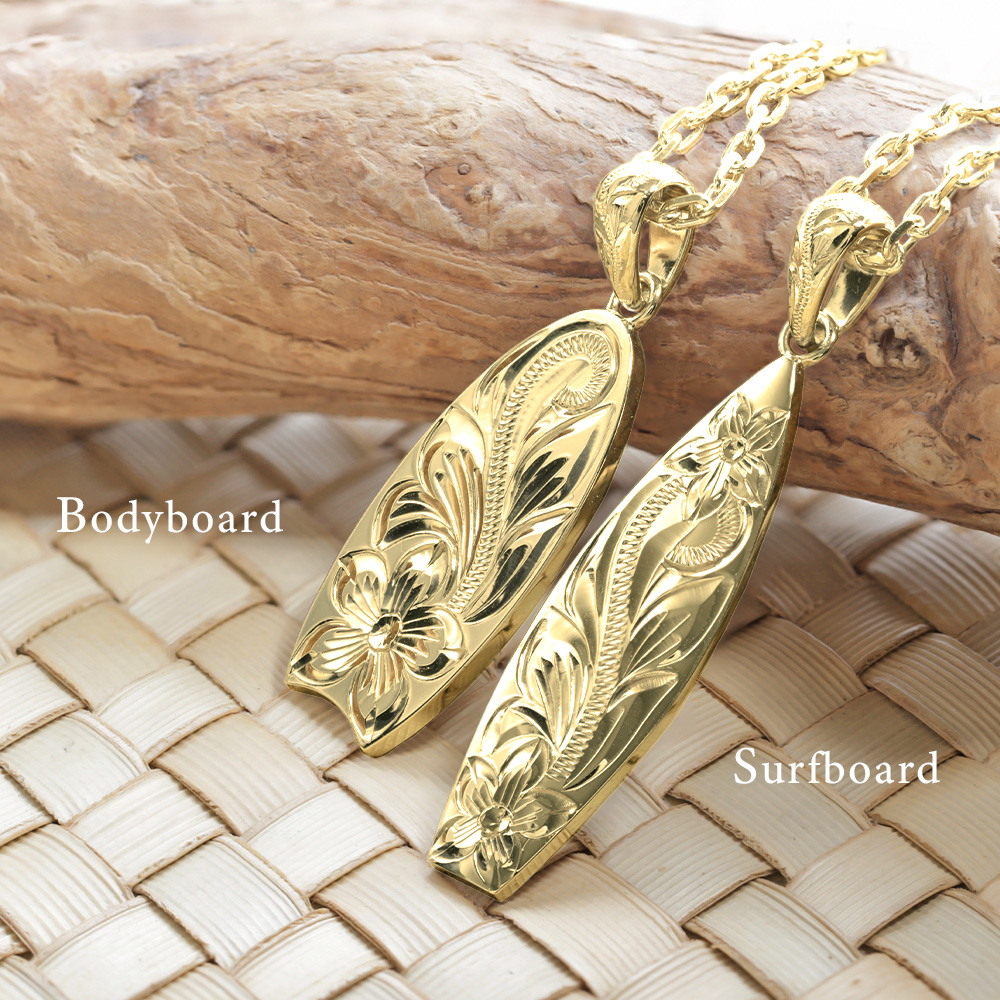 ハワイを身近に感じられるサーフボード型の爽やかなネックレス。バチカンにまで刻まれたスクロール模様と程よい厚みが特徴です。