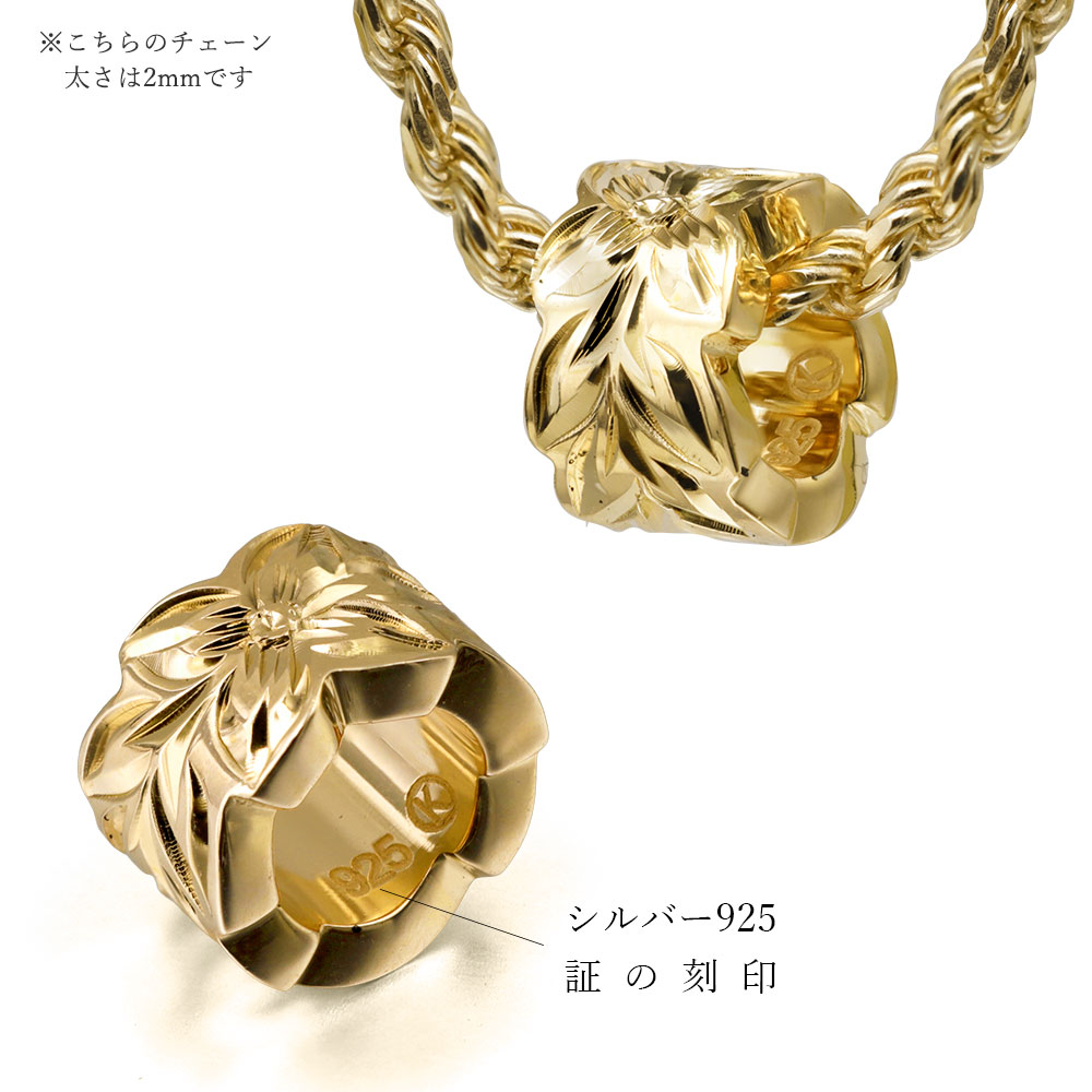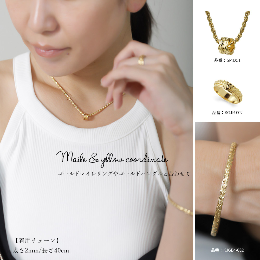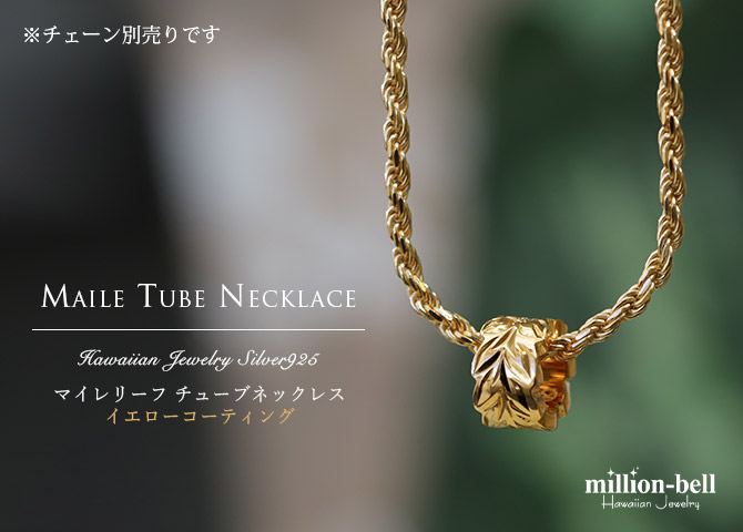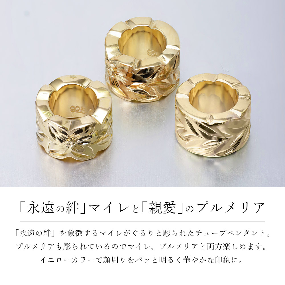 胸元のアクセントに映えるイエローコーティング。「永遠の絆」を意味するマイレがぐるりと一周彫られたチューブペンダント。
